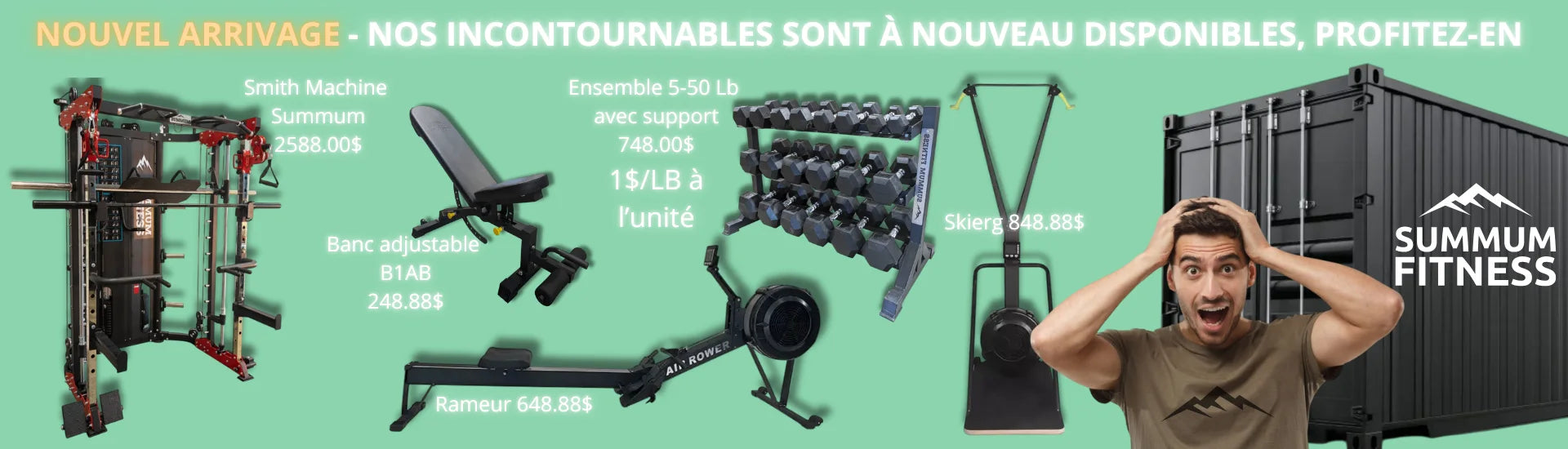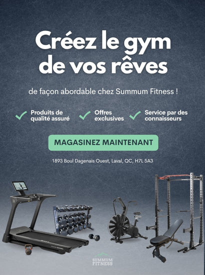 Bienvenue chez Summum Fitness, votre destination ultime pour l'équipement de fitness et de gym à domicile de haute qualité au Canada. Nous proposons une large sélection de produits d'entraînement pour tous les budgets, que vous cherchiez à installer une salle de sport complète à domicile ou simplement à trouver des équipements spécifiques pour vos séances d'entraînement. En tant que magasin de fitness de confiance, nous fournissons à nos clients les meilleurs équipements de gym disponibles au Canada pour vous aider à atteindre vos objectifs de remise en forme facilement dans le confort de votre maison.