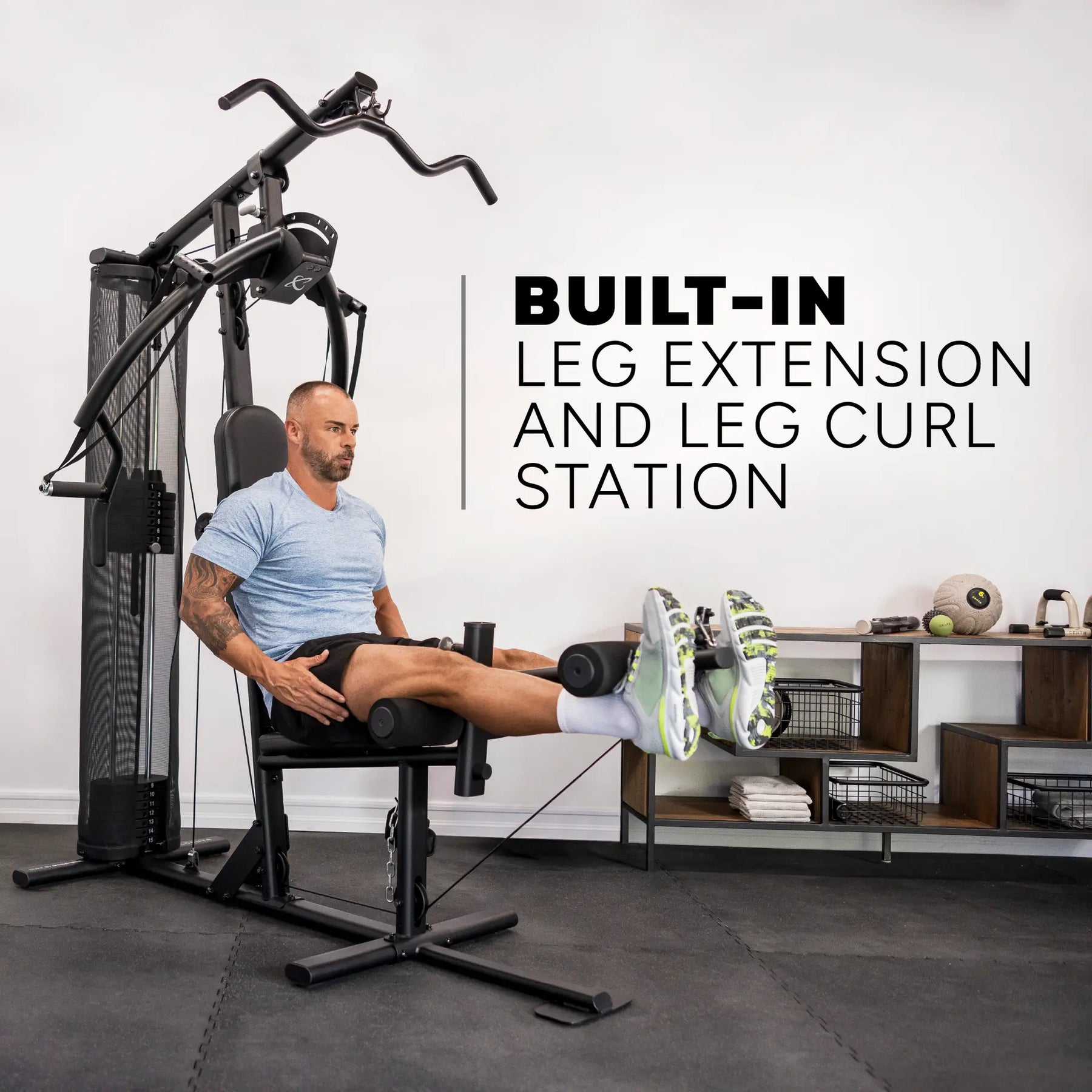 Fixed press arms, two pulleys, free motion handles, and a leg curl and extension station offer maximum exercise variety.