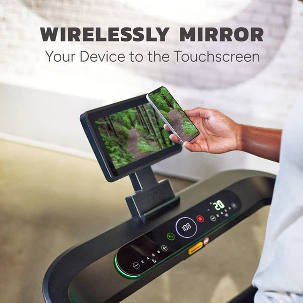 Engineered with a quiet, energy-efficient, 3.0 HP brushless motor, the Centr Runr-S is easy to control with quick keys, reaching speeds of up to 10 mph and a 12% incline and has a spacious 20” x 55” running surface. Connect your heart rate device via Bluetooth and track your effort through the 5-color heart rate zone display on the console. Stay motivated with pre-loaded apps such as Netflix, Disney+, YouTube, and more, or wirelessly mirror your device to the Runr-S touchscreen.